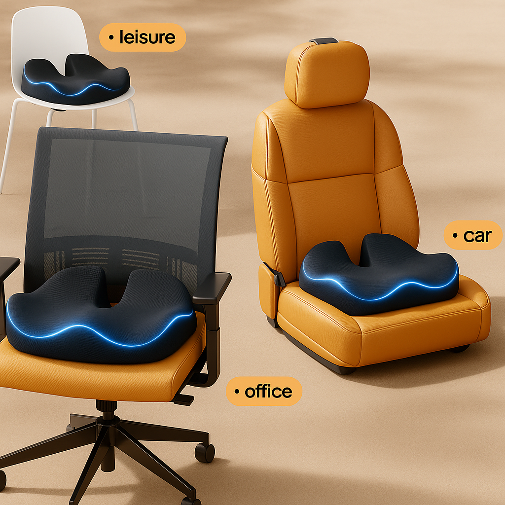 SpineEase™ Cushion: Engineered with ergonomic memory foam to relieve tailbone pressure & improve posture – anytime, anywhere.